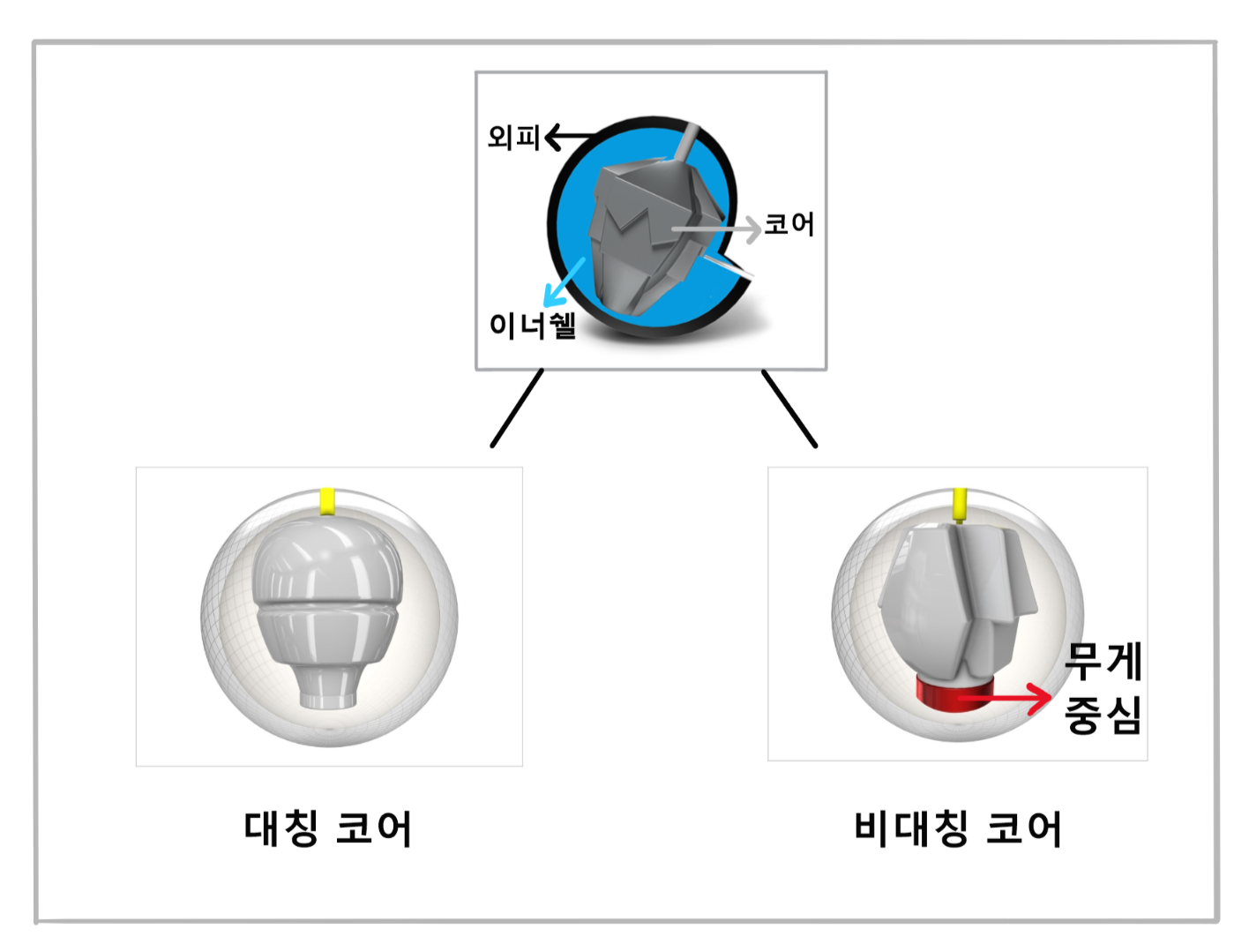 코어의 모양에 따라서 볼링공의 반응이 달라지게 되는데, 코어는 대표적으로 2가지 종류로 나뉩니다.