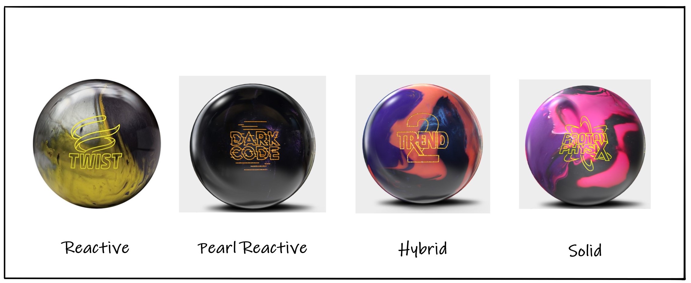 스페어볼, 하드볼 - 스페어 볼링공, 볼링공 하드 볼 = 플라스틱 재질로 이루어져 있으며, 코어가 존재하지 않아 직진성이 강하여 스페어 할 때 주로 사용하며 스페어 볼링공 또는 볼링공 하드볼 이라고 부릅니다.