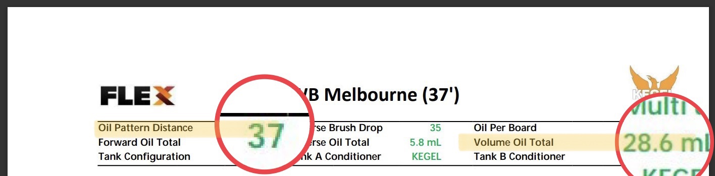 60피트의 레인 길이 중 37피트 까지 오일이 도포되어 있다는 것을 알 수 있습니다. - Volume Oil Total - 28.6mL
