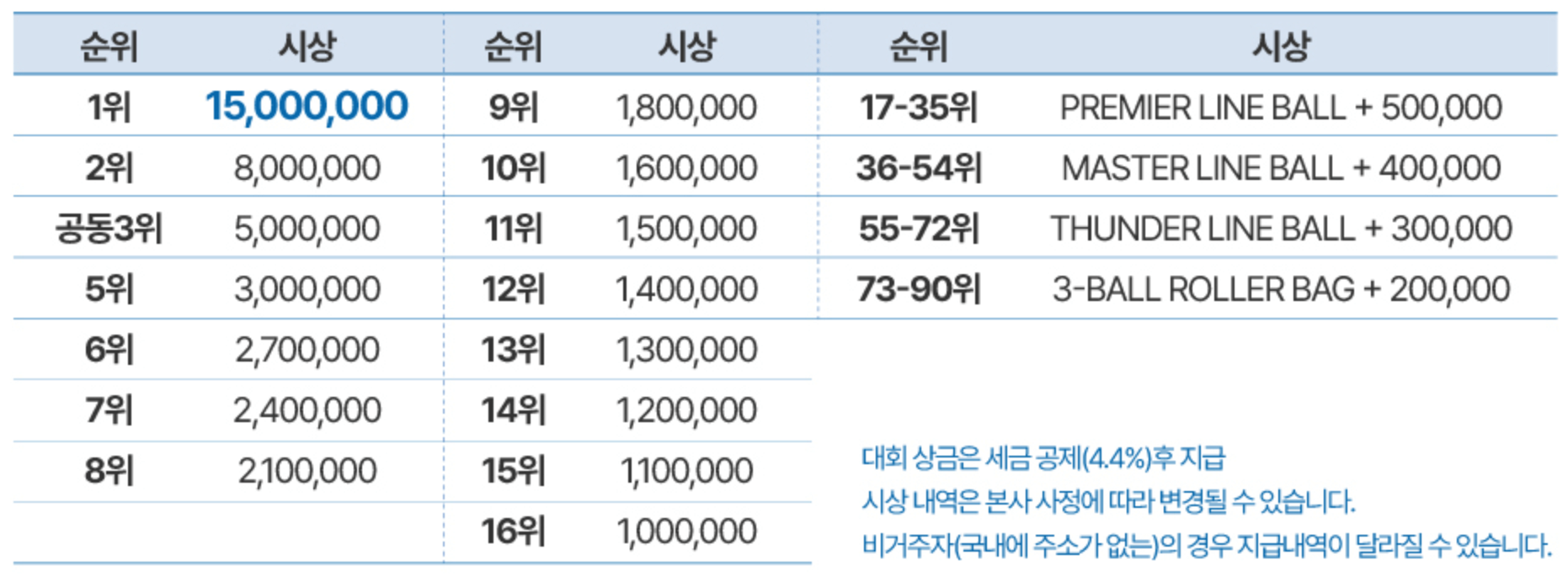대회 1등 상금은 1,500만 원으로 상금이 매우 높습니다. 1위부터 90위까지 시상금이 있으며, 800시리즈 달성 시 상패를 증정합니다.